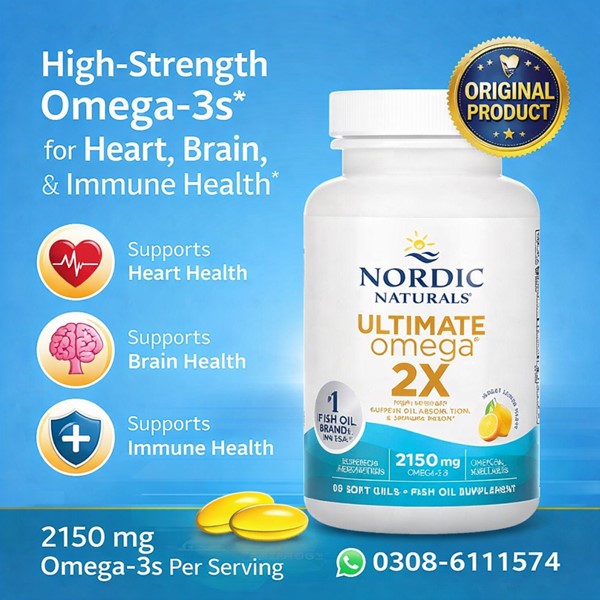 Nordic Naturals Ultimate Omega In Pakistan Is A Premium Fish Oil Supplement Formulated With High Concentrations Of Epa (Eicosapentaenoic Acid) And Dha (Docosahexaenoic Acid). Sourced From Wild-caught Fish, This Supplement Is Purified And Molecularly Distilled To Ensure High Quality, Freshness, And Purity. Ultimate Omega Is Designed To Support Heart Health, Brain Function, Mood Balance, And Joint Flexibility. The Soft Gels Are Easy To Swallow And Typically Have A Pleasant Lemon Flavor To Reduce Fishy Aftertaste.