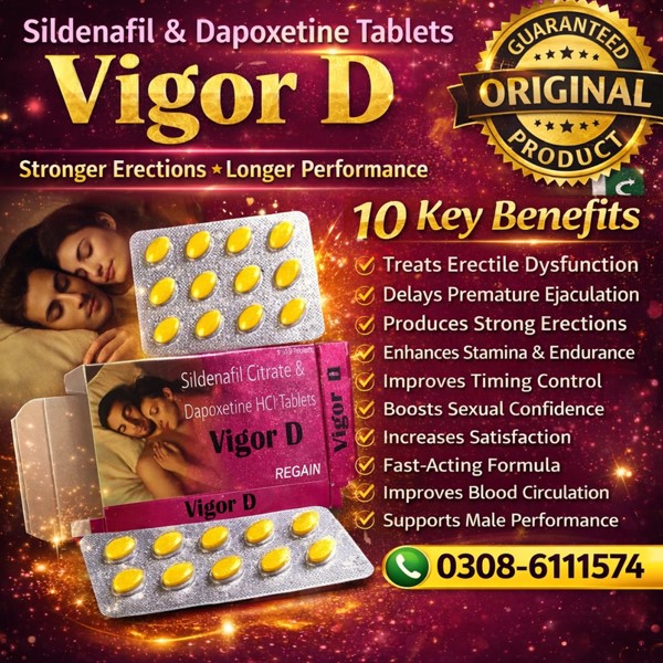 Vigor D Sildenafil & Dapoxetine Tablets In Pakistan Are A Powerful Dual-action Formula Designed To Help Men Who Face Both Erectile Dysfunction (Ed) And Premature Ejaculation (Pe). This Advanced Combination Contains Sildenafil Citrate, Which Increases Blood Flow To The Penis To Support Firm And Reliable Erections, And Dapoxetine, Which Helps Delay Climax And Improve Control. It Is Ideal For Men Seeking A Complete Solution For Stronger Performance, Longer Endurance, And Restored Confidence.
